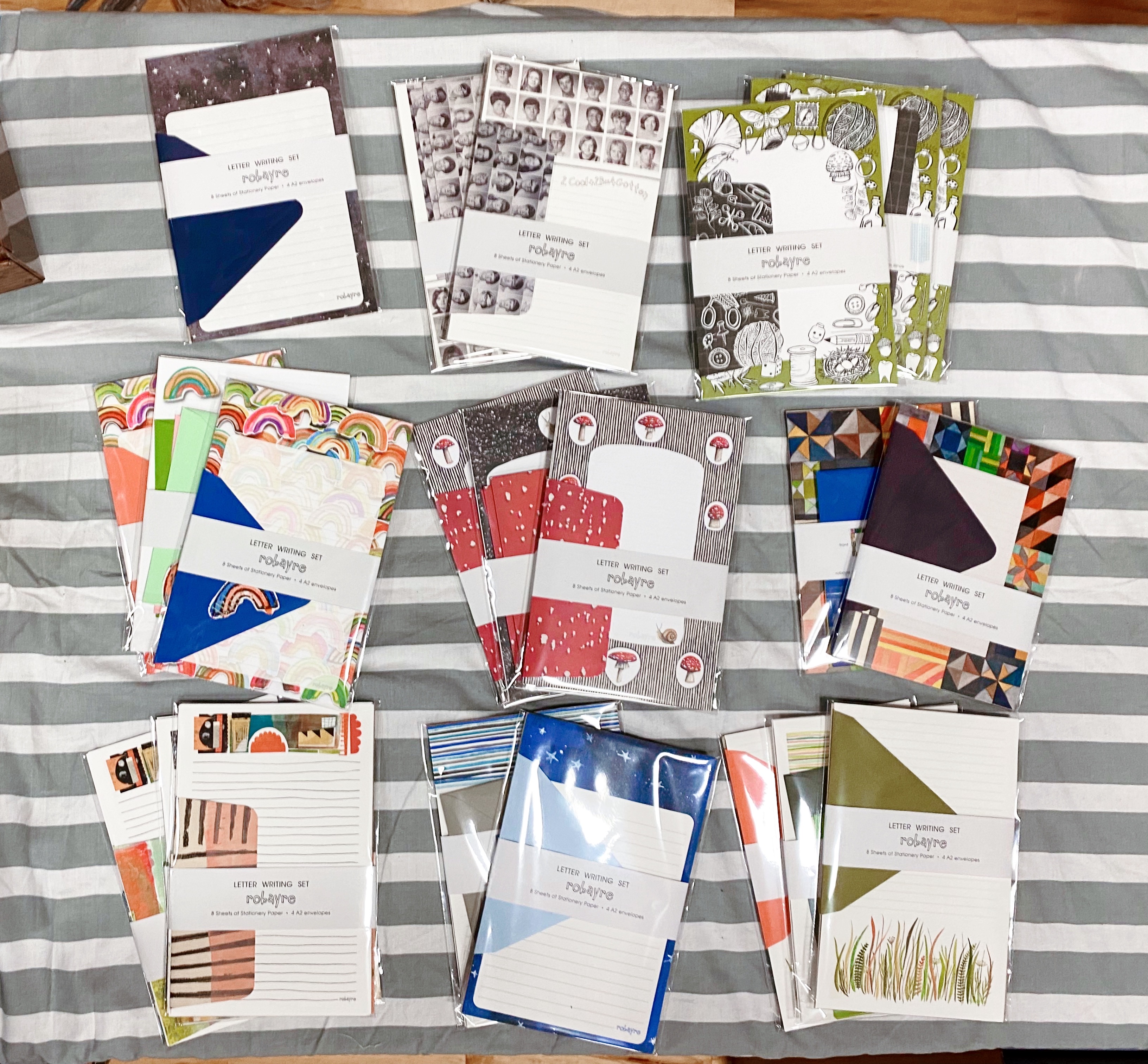 In my etsy shop they are sold in 5.75×4.5 cellos, because I can share pictures of what the stationery actually looks like. At shows, it’s harder for people to get that same idea when the product is all folded up and sealed, so now I have sets that would work at shows and in shops. The back has thumbnails to show what each set includes.