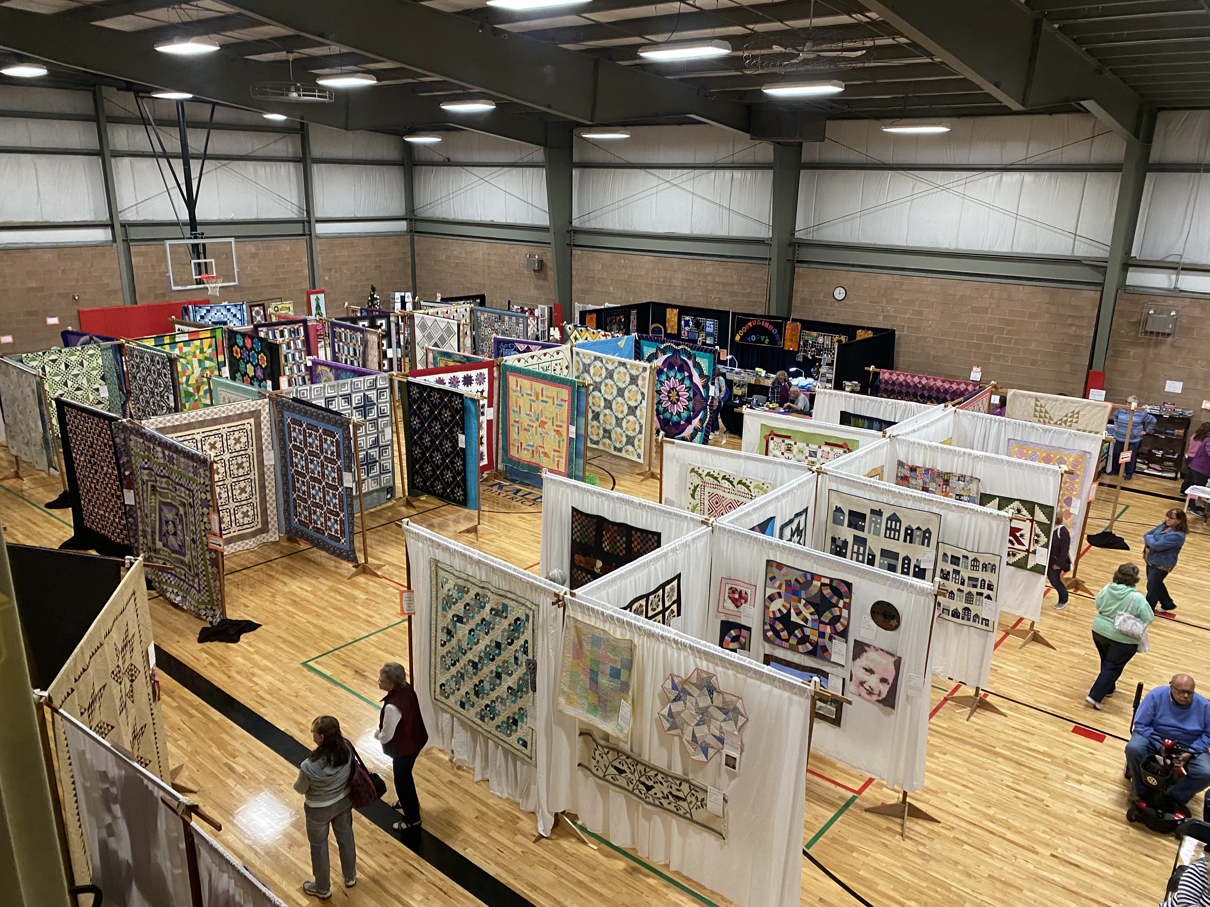 Apparently I didn’t take a single picture of my booth at the quilt show. Here is a pic of the quilts on display. My booth was on the far wall in this pic. I finally put together labels for my stationery sets, so they’d be more display presentable.