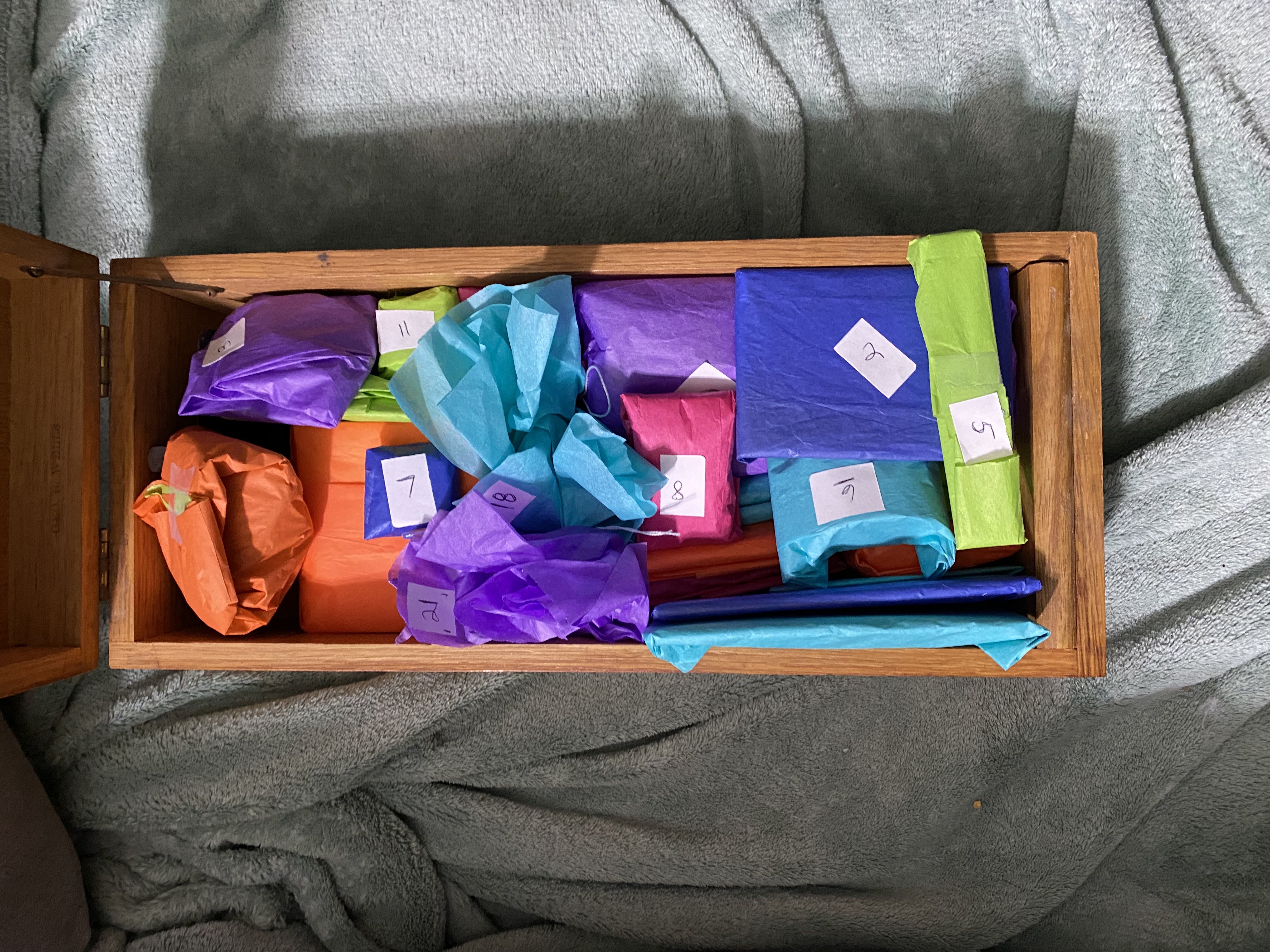 this box filled with 26 tiny wrapped presents. I’ll post more about it soon.