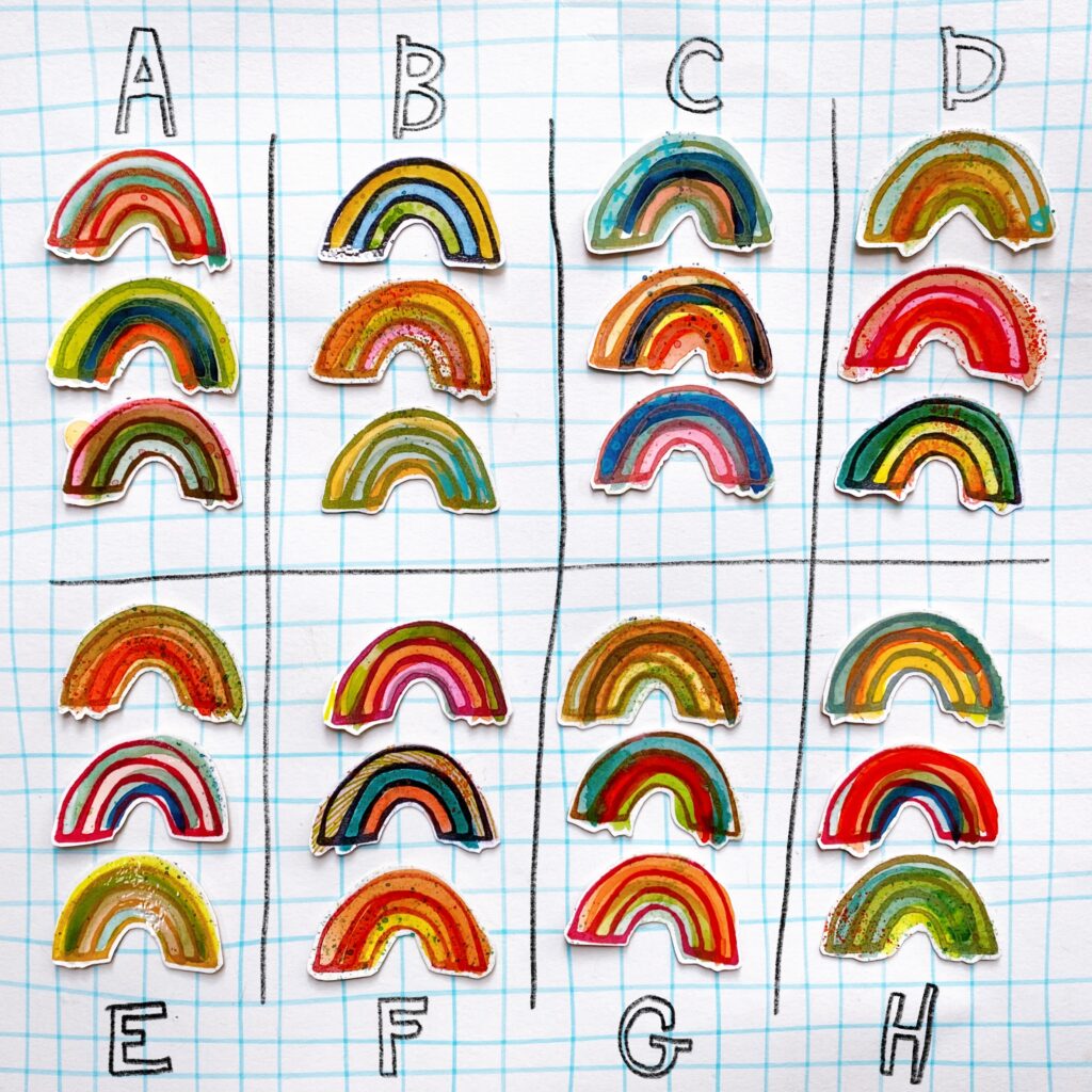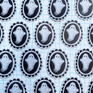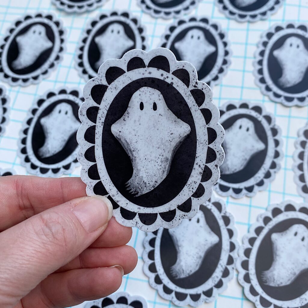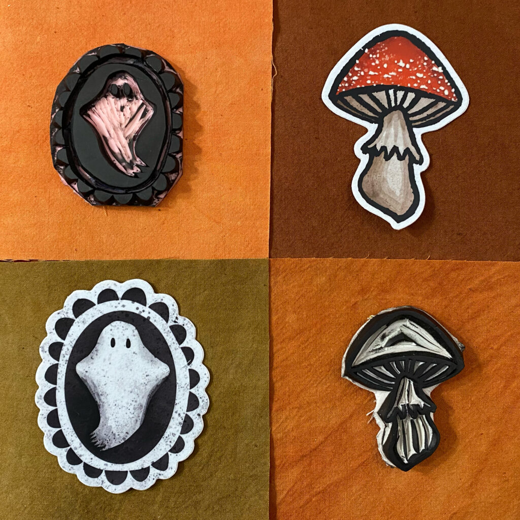 Since those first rainbow stickers were digitally inspired by my hand-carved stamp rainbow stickers, I thought I would recreate some more of my handcarved stamped stickers digitally. I LOVE the Mushroom and Ghost stickers I make so much, but they can be a bit more labor intensive than the others, so I thought they would be perfect to make digitally and get them printed. When I make them by hand, they are stamped and then individually watercolored. I add adhesive to the back and packing tape to the front for protection. All the same, those are not weatherproof, so it’s nice to offer stickers to people, knowing that if they get wet, they won’t fall apart.