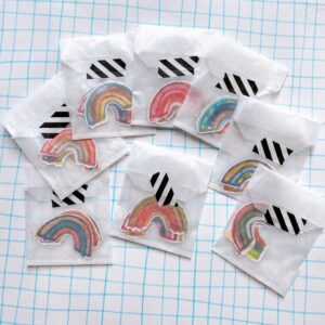 These stickers are all one of a kind, and handmade using my handcarved stamp, individually watercolored. They have a plastic top, but are not water or weatherproof.