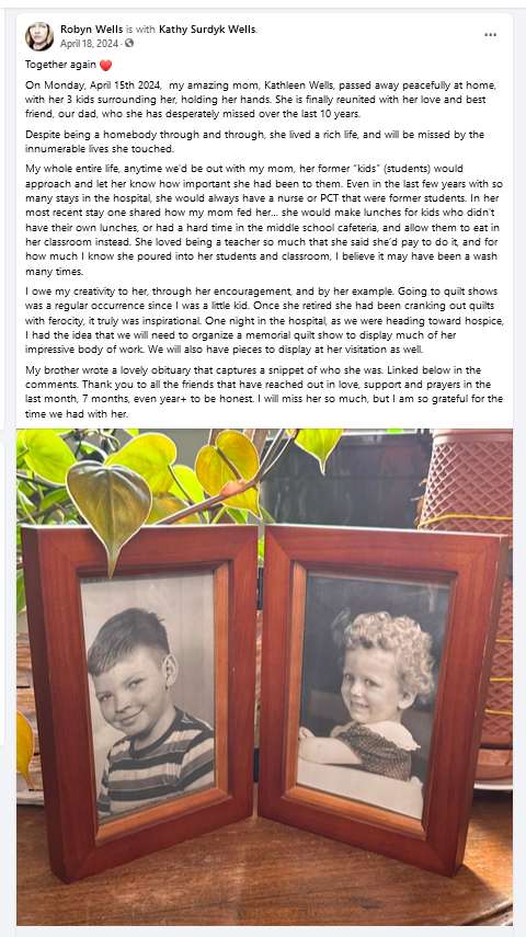 Today is January 31st, 2025, but I will be post dating this post to April of last year, so that I can then proceed and share other things that have happened since. I really haven’t posted to the blog in all of 2024 because losing my mom was so hard. In some ways it felt like life ground to a halt, and in other ways it felt like a shotgun start to a sprint we didn’t want to run. I couldn’t post regular old posts to the blog until I shared this, but also, how do you make a post like this?