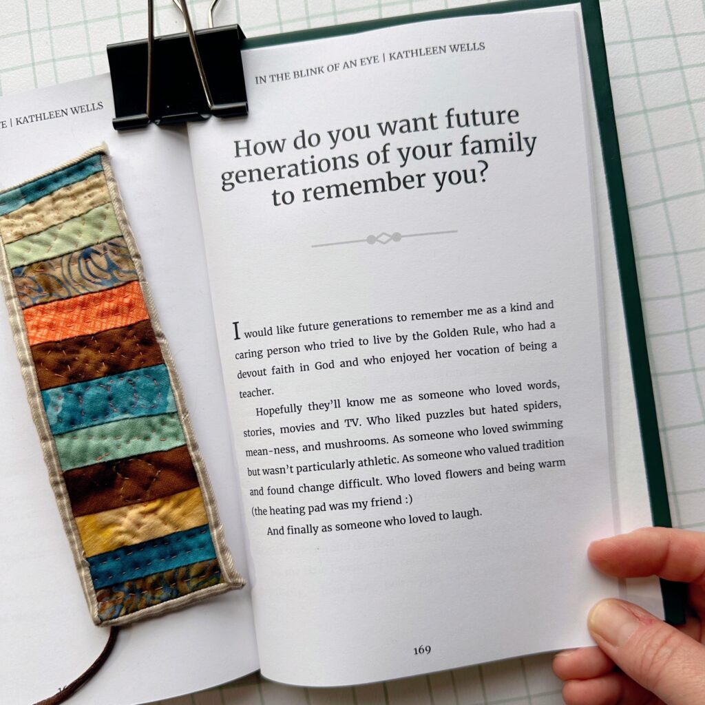 Hopefully they’ll know me as someone who loved words, stories, movies and TV. Who liked puzzles but hated spiders, mean-ness, and mushrooms. As someone who valued tradition and found change difficult. Who loved flowers and being warm (the heating pad was my friend :)